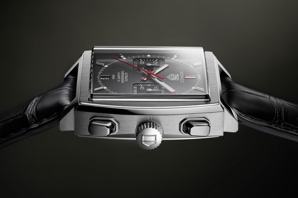 The crown and pushers on the replica are positioned correctly, with the crown placed on the left side—one of the signature Monaco design elements. The pushers have a decent tactile response, although they lack the crisp, mechanical click found on the genuine TAG Heuer model.